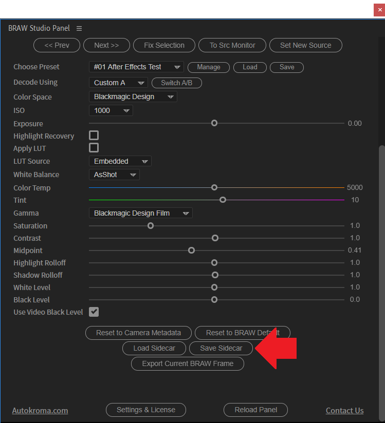 First solution : you export your RAW Parameters in the .sidecar by pressing the button "Update Sidecar" in the Source Settings BEFORE sending the BRAW file to After Effects via Dynamic Link, After Effects will load the values inside this Sidecar file by default (because of the "Camera Metadata" decoding mode as described previously).